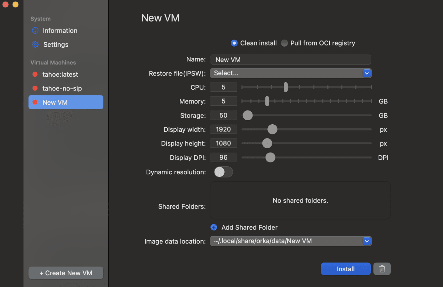 The Tahoe beta image included in the orka-images repository is pre-configured with 90 GB storage, 5 CPUs, and has a default display width of 1920x1080px and 96 DPI resolution. After you’ve clicked ‘Pull’ the image should begin downloading. Once the pull is completed, you can then start your Tahoe beta VM.