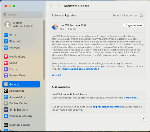 Navigate to System Settings > General > Software Update, and click Upgrade Now to start the upgrade process.