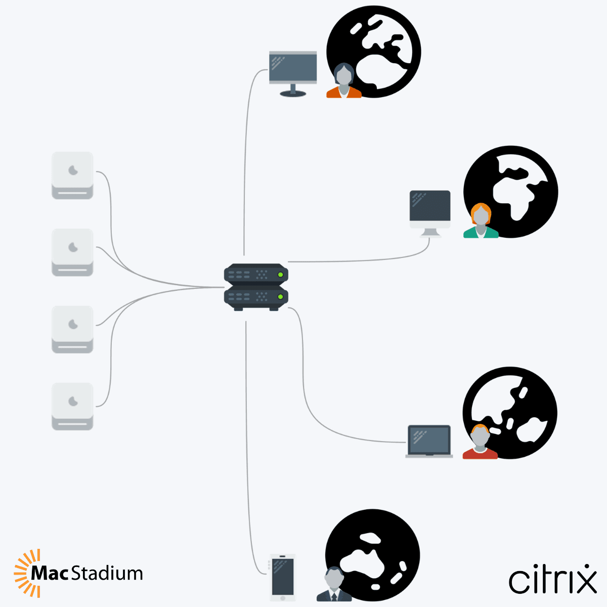 Shared Mac resources are not just a want, but a need for IT teams who want an efficient and simplified device management process. With Citrix VDA for macOS + MacStadium, you can provide shared, high-performance macOS desktops to developers anywhere in the world, including contract, remote, or international users.