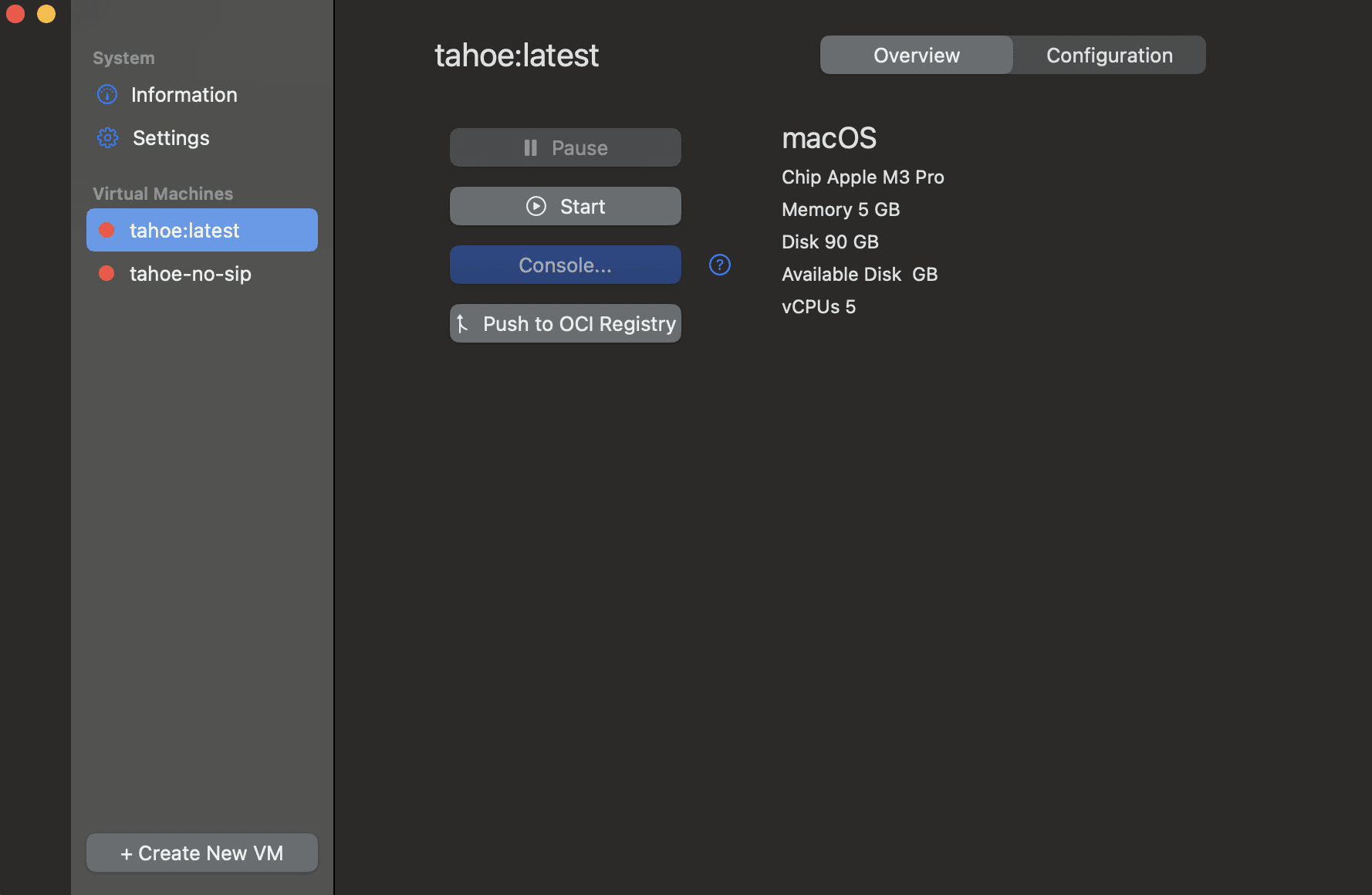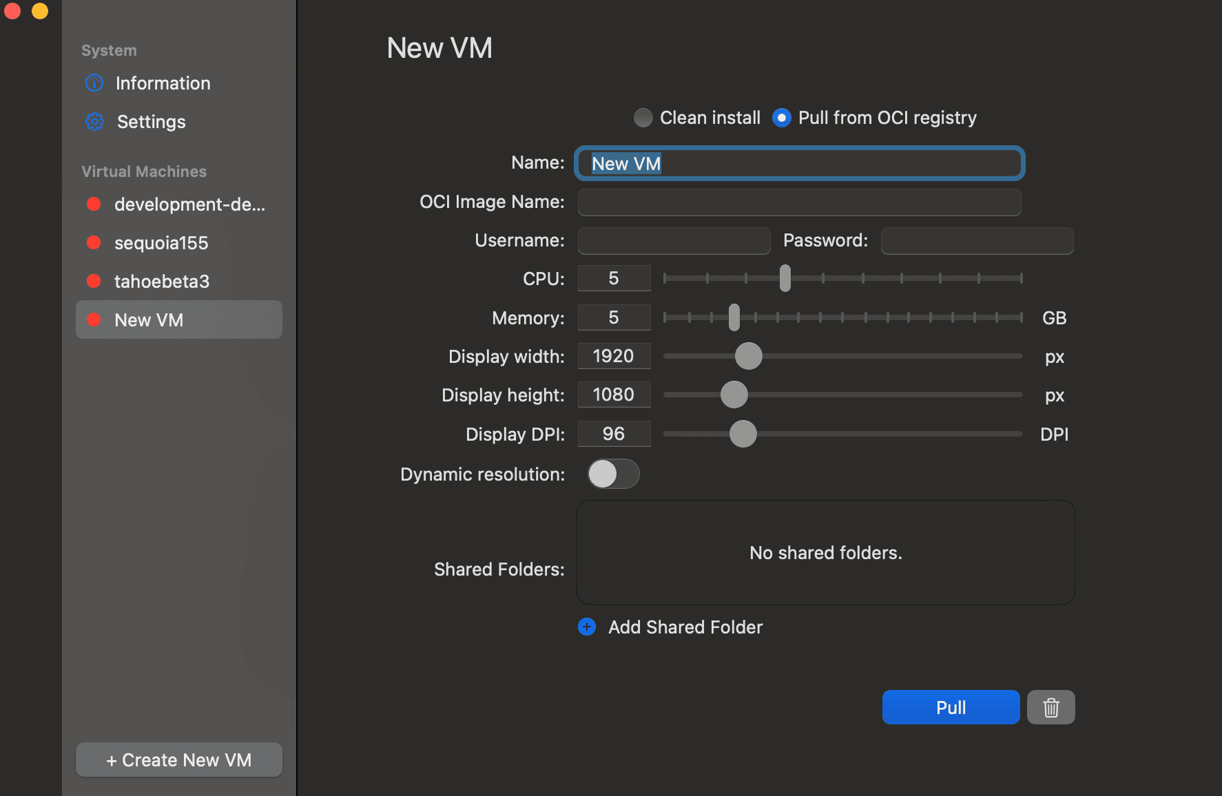 MacStadium provides two flavors of images - a base image with macOS installed, and a no-sip image, configured with SIP protection disabled to allow for security testing. After opening Orka Desktop, click ‘Create New VM’ and navigate to the ‘Pull from OCI registry’ option. From there, you can name your VM whatever you prefer. In the ‘OCI image name’ field, enter the following option to pull the MacStadium Tahoe image from GHCR:
