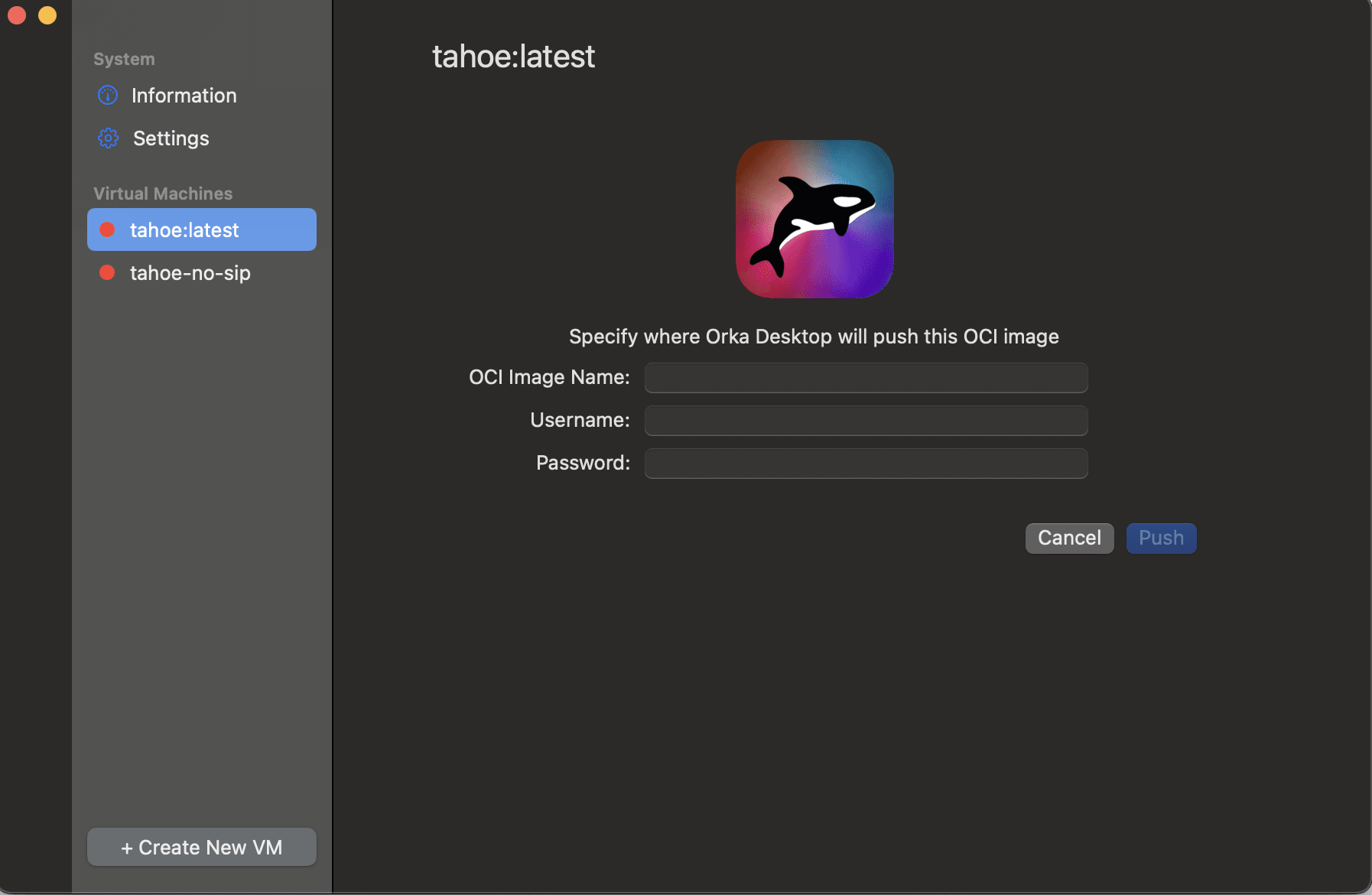 Orka Desktop makes pushing an image to GHCR seamless. Once you’ve saved your VM image, you can click ‘Push to OCI registry’.