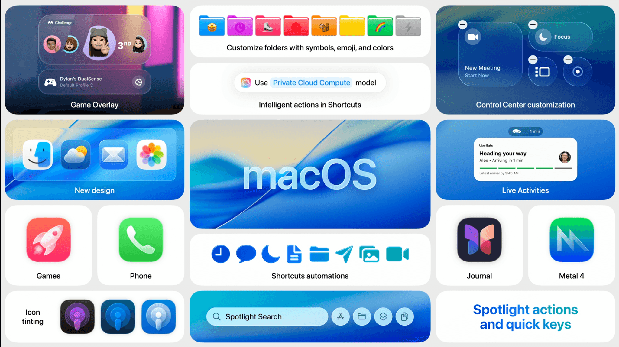 - Major Spotlight overhaul: Spotlight now supports intelligent filtering, quick keys, and hundreds of direct actions (like sending emails or launching shortcuts), making it easier to find and act on content across Mac and iPhone apps.